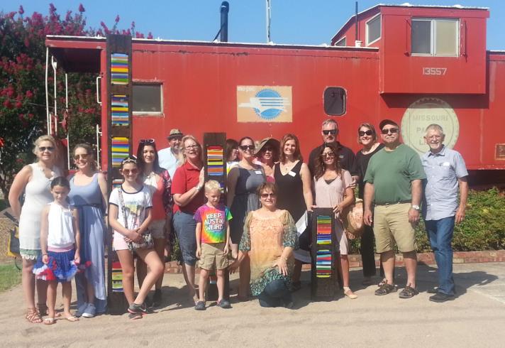 The Forney Arts Council and guests attended the unveiling of the art project "Forney, 75126" on July 20, 2017 downtown at the Red Caboose. The artist explained the reason for using railroad ties to tie Forney and the railroad together, and the stained glass groups represent box-cars of people, who are the different colors of glass. She said the sculpture was designed for people to take photographs with.