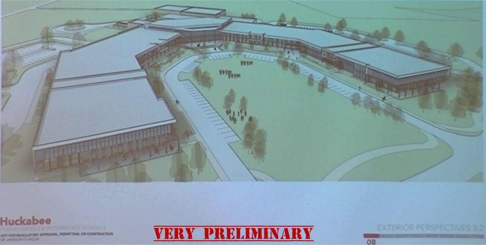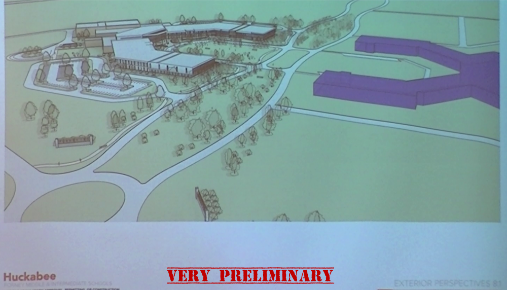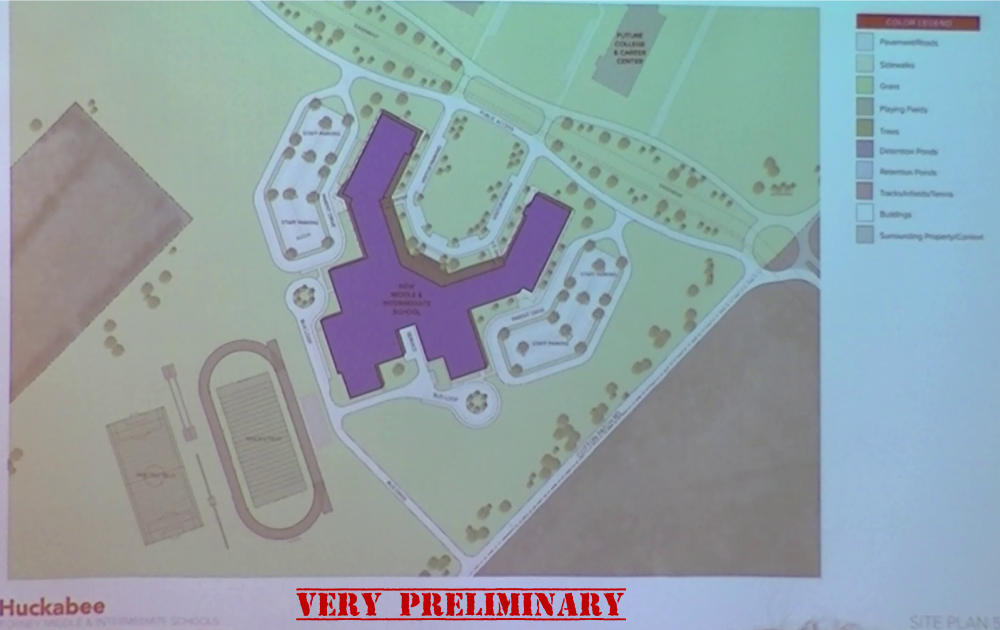 • Held a 60-minute facilities workshop, discussing proposed combination middle and intermediate school.  Dr. Terry stressed this is a very early stage of pre-design.  Huckabee staff Gary and Kip showed the draft-mode plans.  They stressed this is still a very fluid design, there will be many steps of revision to come.
