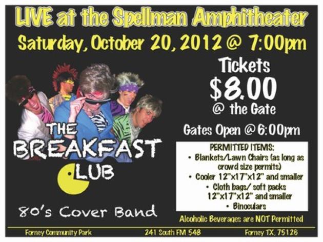 Live Concert at the Spellman Ampitheater: The Breakfast Club, Saturday, Oct. 20, 2012, Gates open at 6:00 pm, Tickets are $8 at the gate.