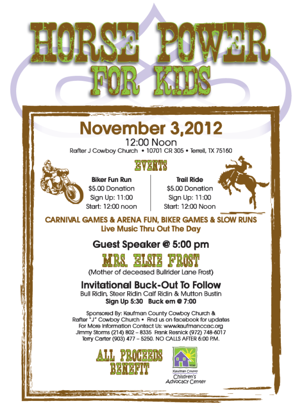 Horsepower for kids, benefitting the Kaufman County Childrens Advocacy Center, Nov. 3 noon - ??, at Rafter J cowboy church in Terrell. Biker fun run, trail ride, carnival games, live music, and a Buck-out.
